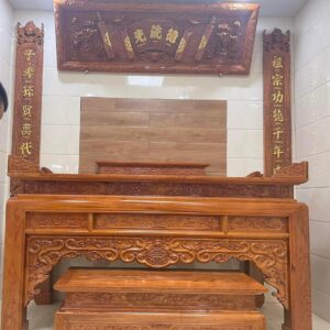 Bộ bàn thờ mẫu Sen lộng thủng gỗ gụ dài 1m97 + Bộ đại tự Đức Lưu Quang 1m97