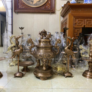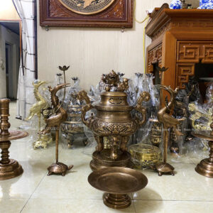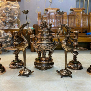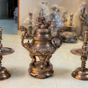 Bộ Ngũ Sự Hoa Sen đúc thủ công bằng đồng đỏ nguyên chất, gồm đủ kích thước: 50 – 55 – 60 – 65 – 70 cm. Mỗi bộ bao gồm: đỉnh – đôi hạc – đôi nến, trọng lượng nặng, đúc liền khối, hoa văn sắc nét. Màu đồng mộc cổ kính, bền 30–50 năm. Giá tốt – giao hàng toàn quốc.