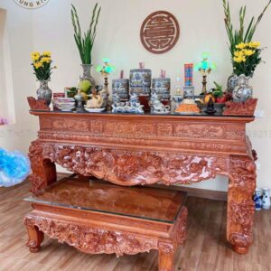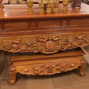 Sập thờ gỗ hương đá mẫu Tứ Linh là lựa chọn hoàn hảo cho không gian thờ cúng trang nghiêm, mang lại sự may mắn và tài lộc. Được chế tác từ gỗ hương đá cao cấp, sập thờ có độ bền vượt trội, vân gỗ đẹp tự nhiên và hương thơm dịu nhẹ. Họa tiết Long – Lân – Quy – Phụng được chạm khắc tinh xảo, tượng trưng cho sự cát tường và hưng thịnh.